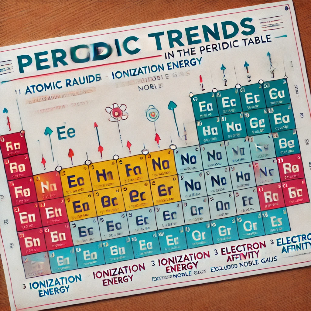 Here is an educational infographic illustrating periodic trends in the periodic table. It highlights the trends for atomic radius, ionization energy, and electron affinity with clear color-coded regions and directional arrows.