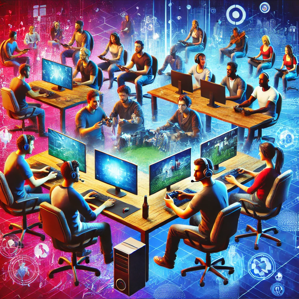 Here is the image that represents the online gaming community. It showcases the collaboration, excitement, and camaraderie of gamers from diverse backgrounds. It captures the essence of this co-culture, where people come together through their shared love for gaming.