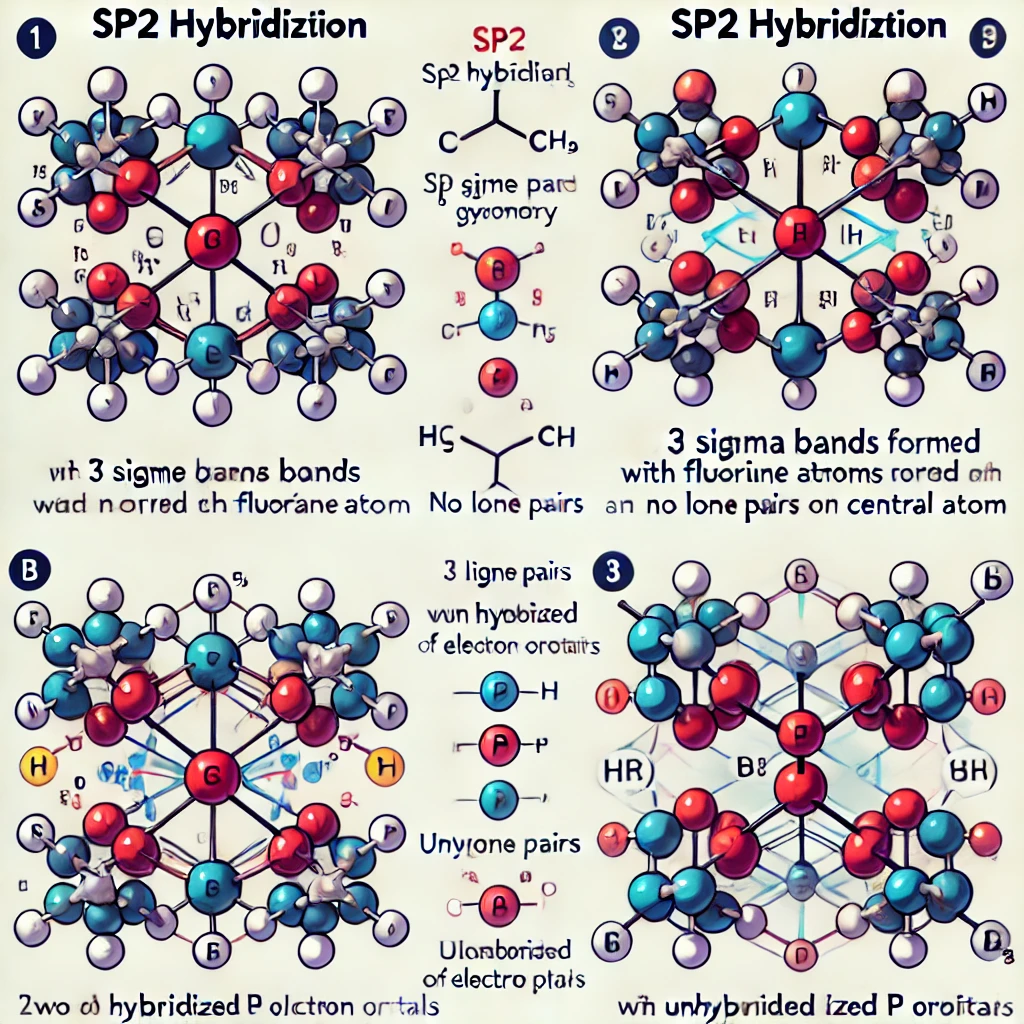 Here is the illustration showing the sp2 hybridization for the central atom with 3 sigma bonds formed with fluorine atoms. It includes both scenarios: one with no lone pairs on the central atom and one with lone pairs occupying unhybridized p orbitals. The bond angles and electron pairs are labeled for clarity.