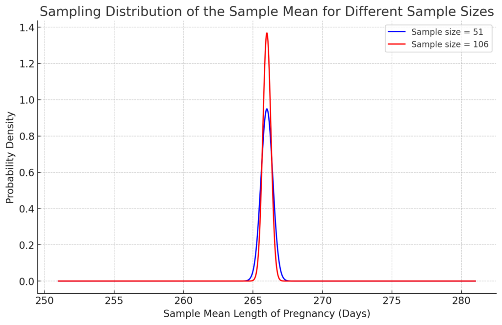 The graph above illustrates the sampling distribution of the sample mean for two different sample sizes: 51 and 106. As you can see, with the larger sample size (106), the distribution of the sample mean is much narrower and more concentrated around the population mean of 266 days, compared to the distribution for the smaller sample size (51). This shows how increasing the sample size reduces the standard error and makes the sample mean more likely to be closer to the population mean.