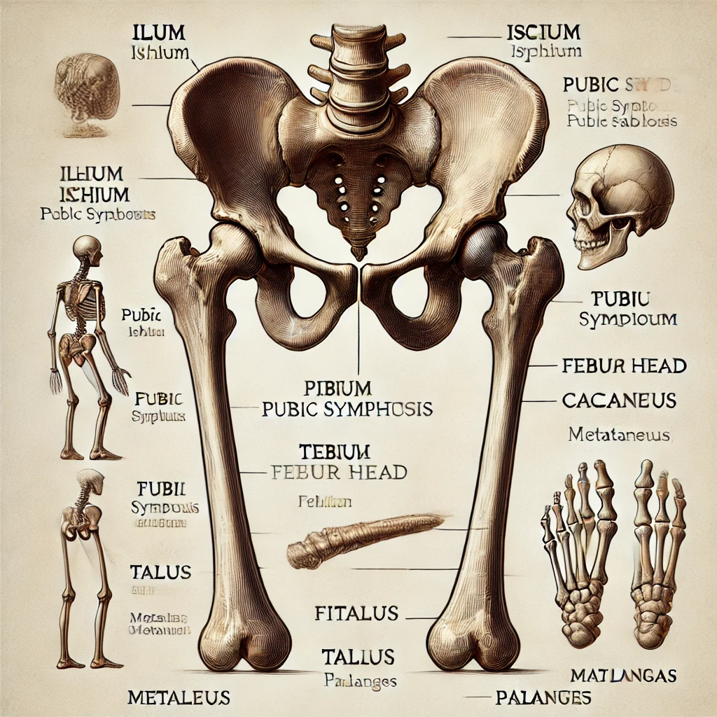 I have generated an anatomical diagram illustrating the human pelvis, femur, tibia, fibula, and foot bones with labeled key features.