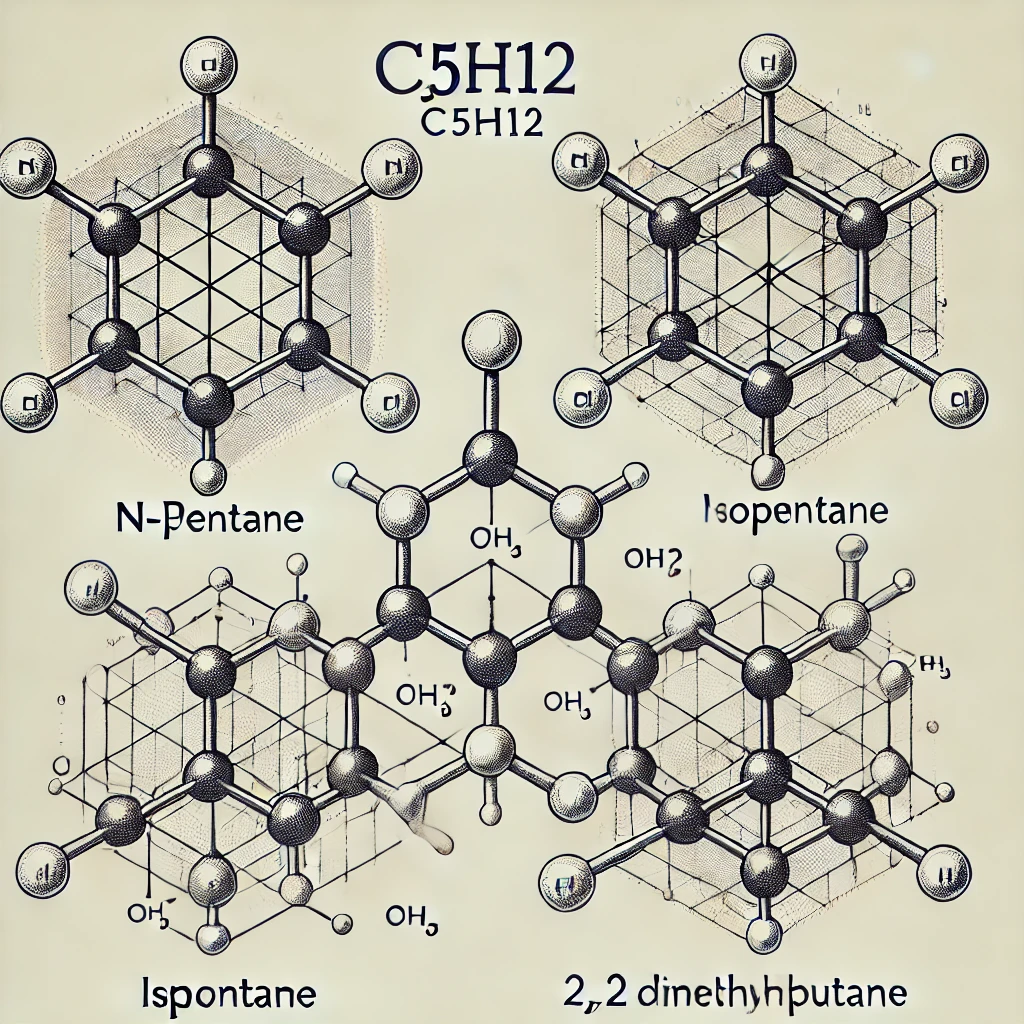 Here is the scientific illustration of the three structural isomers of C₅H₁₂ (pentane). The image shows the molecular structures of n-pentane, isopentane (2-methylbutane), and neopentane (2,2-dimethylpropane) with clear labeling. Let me know if you need any modifications or further explanations!