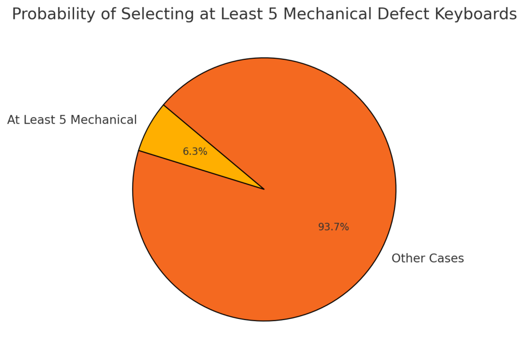 Here is a pie chart illustrating the probability of selecting at least 5 mechanical defect keyboards. The portion labeled “At Least 5 Mechanical” (6.34%) represents the probability of this scenario occurring, while the remaining portion represents all other possible selections. This visualization helps to understand the likelihood of drawing mostly mechanical defect keyboards in a random selection.