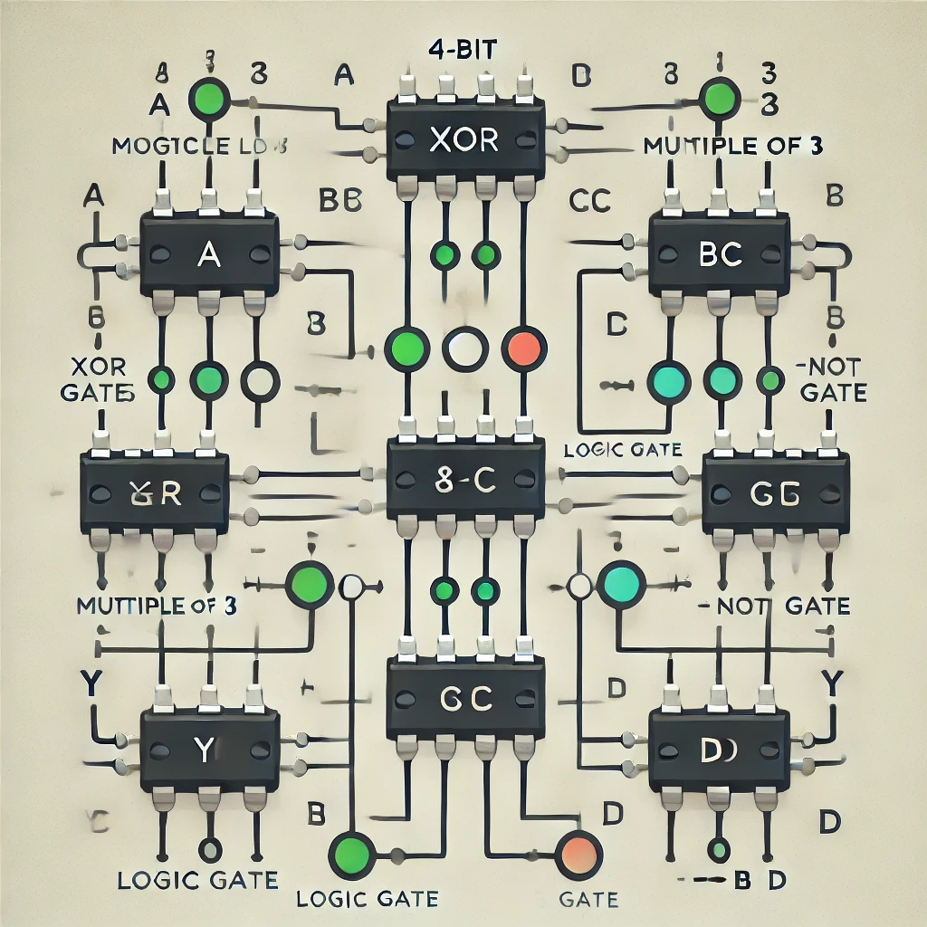 Here is the digital logic circuit diagram that detects multiples of 3 for a 4-bit binary input. The circuit follows the equation: