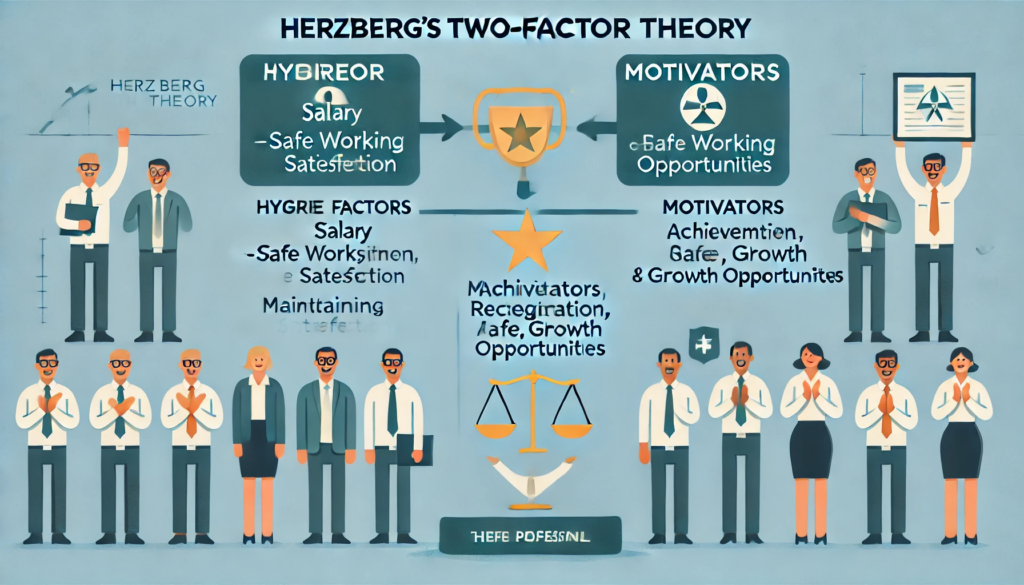 Here is the visual representation of Herzberg’s Two-Factor Theory, clearly depicting hygiene factors and motivators. Hygiene factors (safe working conditions, salary) maintain basic satisfaction, whereas motivators (achievement, recognition, growth opportunities) actively enhance motivation and employee engagement.