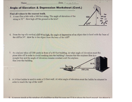 Name Date Angle of Elevation & Depression Worksheet (Cont.)