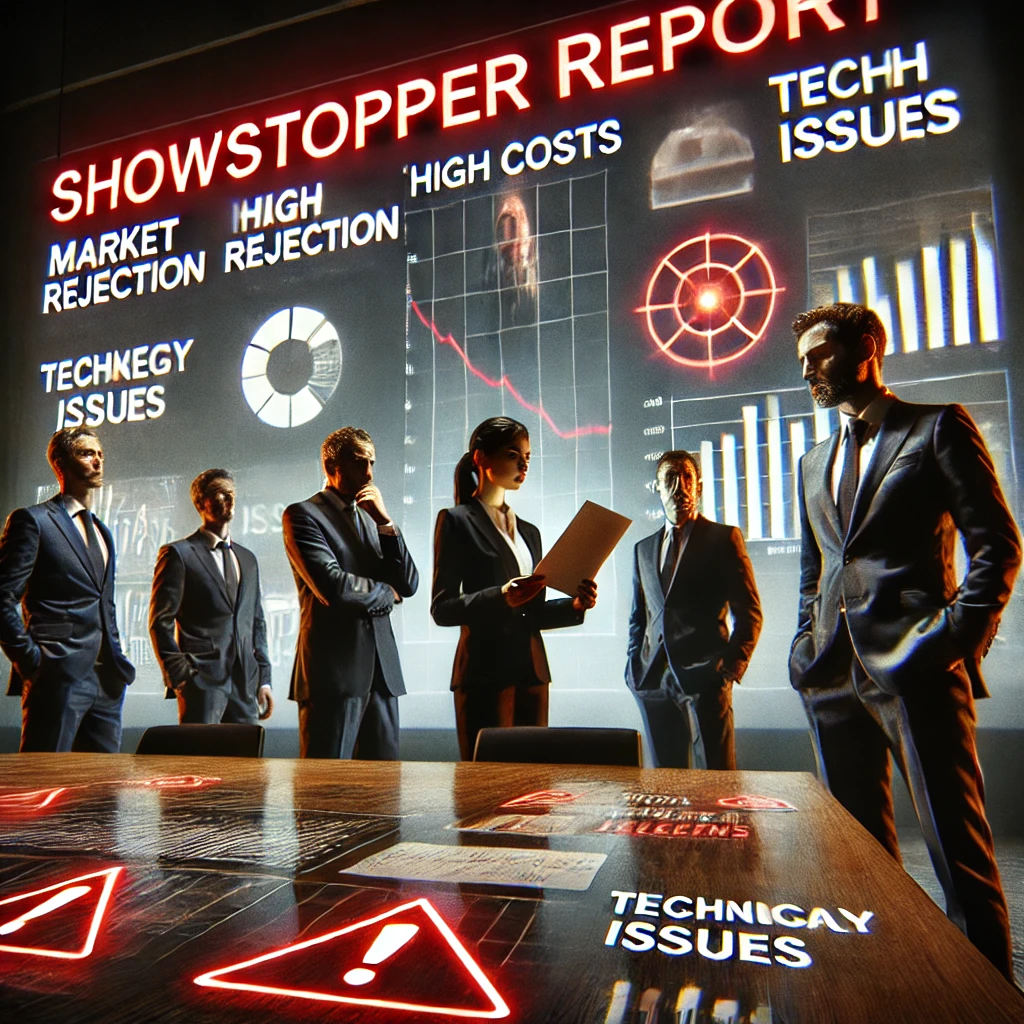 Here is the image representing a showstopper in a business setting. It illustrates a tense meeting where executives are analyzing a failed product launch due to critical issues like market rejection, high costs, and technical problems.