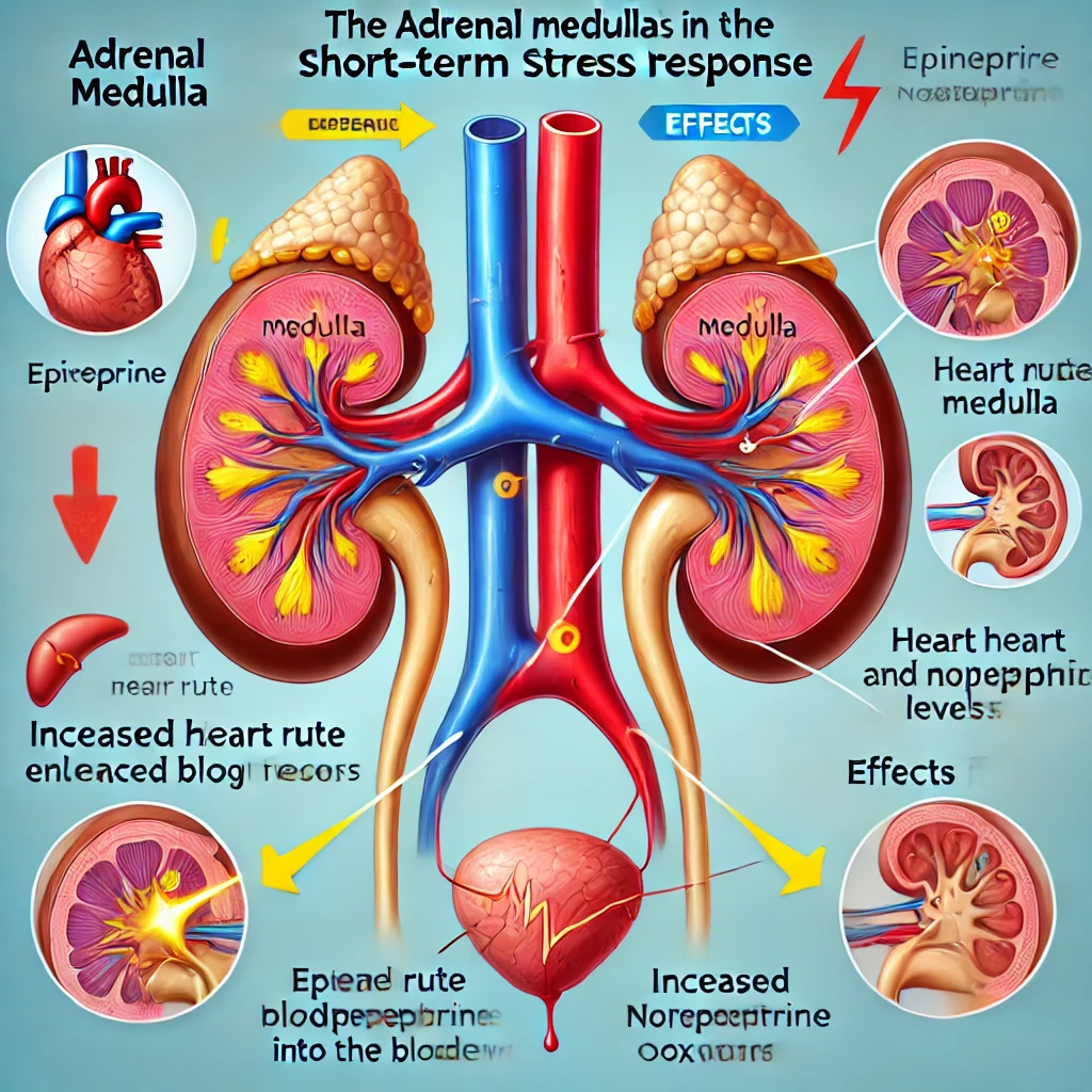 Here is an educational diagram illustrating the adrenal medulla’s role in the short-term stress response. It highlights the adrenal glands, the release of epinephrine and norepinephrine, and their effects on the body, such as increased heart rate and elevated blood glucose levels.