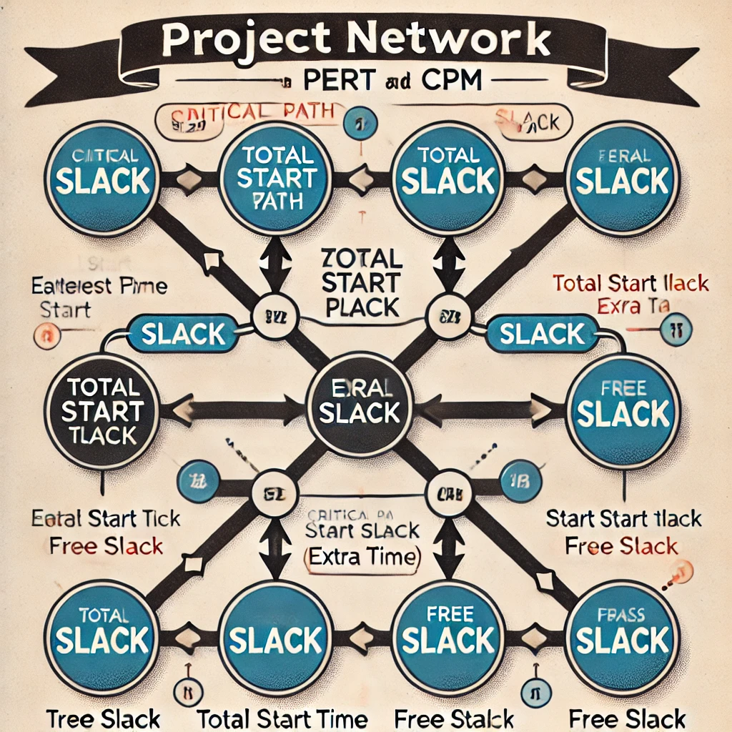 Here is an image illustrating slack in PERT and CPM, including the critical path, total slack, free slack, and key scheduling components. Let me know if you need any modifications or further explanations!