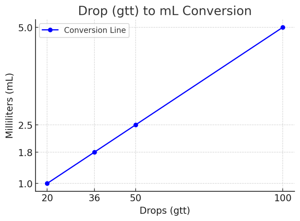 The conversion from drops (gtt) to milliliters (mL) depends on the drop factor, which varies based on the liquid’s viscosity and the dropper used. However, in medical and pharmaceutical calculations, the standard drop factor for aqueous (water-like) solutions is 20 gtt = 1 mL.