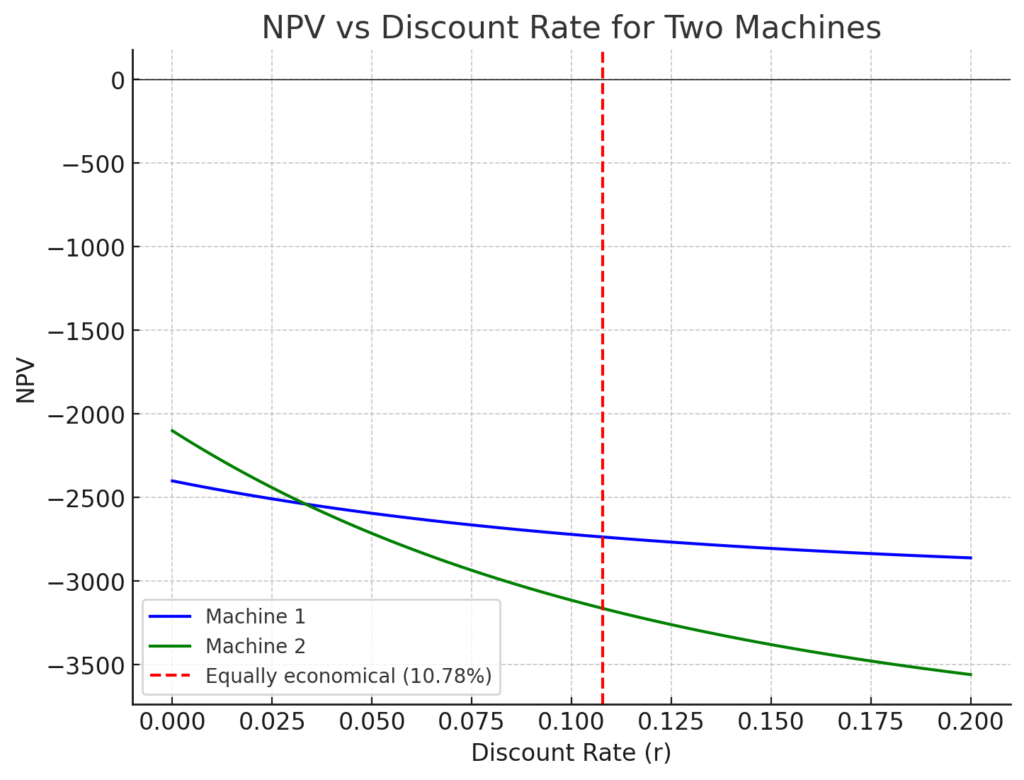 The graph above shows the NPVs for both machines as a function of the discount rate. You can see that at a discount rate of approximately 10.78%, the NPVs for both machines are equal, indicating that it would be equally economical to choose either machine at this rate.