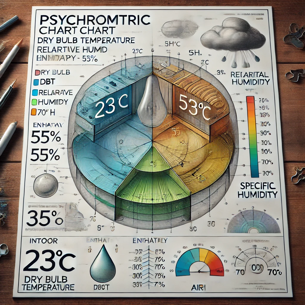 I’ll generate a psychrometric chart to illustrate the enthalpy and specific humidity values needed for these calculations and give you a visual representation of the system design.