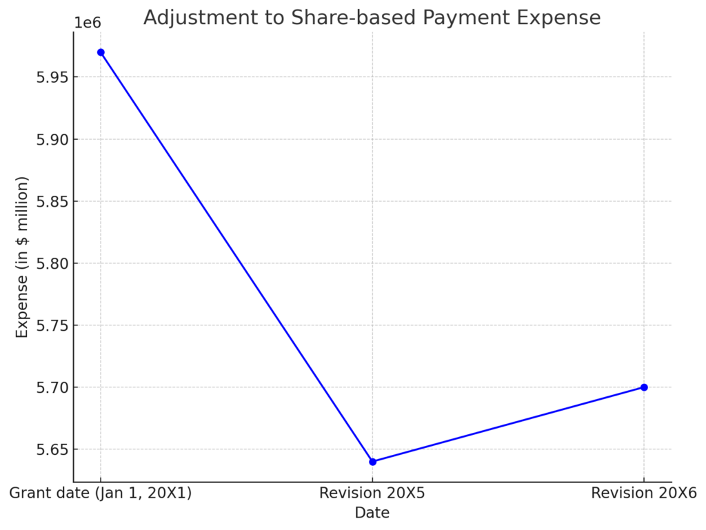 - Final revised expense in 20X6 (after turnover estimate change): With actual turnover at 5%, the final estimate of vested options is 95%. The adjusted value would be $6,000,000 × 95% = $5,700,000.