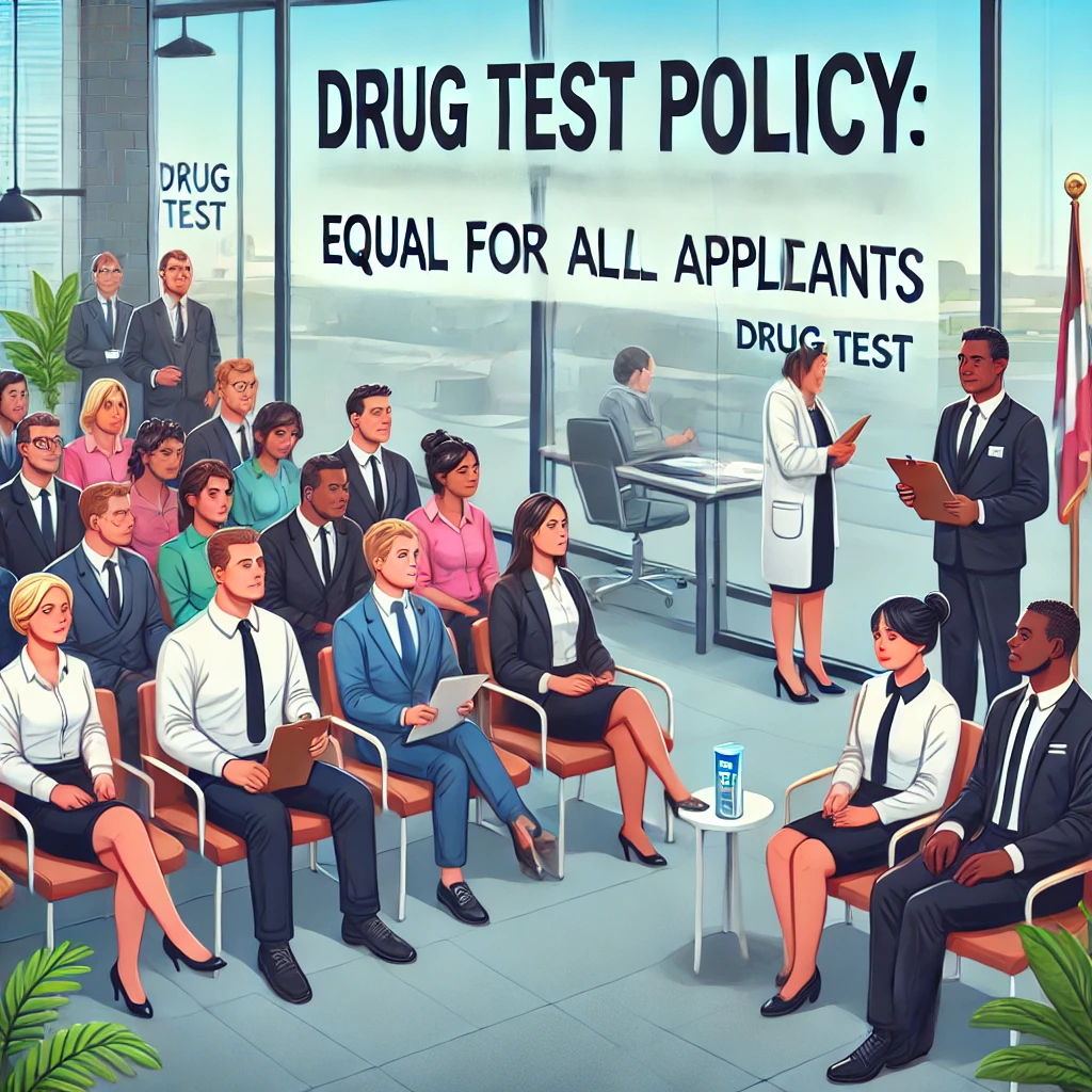 Here is an image that visually represents the concept of a fair and equal hiring process with drug testing. It emphasizes the importance of treating all applicants equally, which aligns with the best advice for Baran.