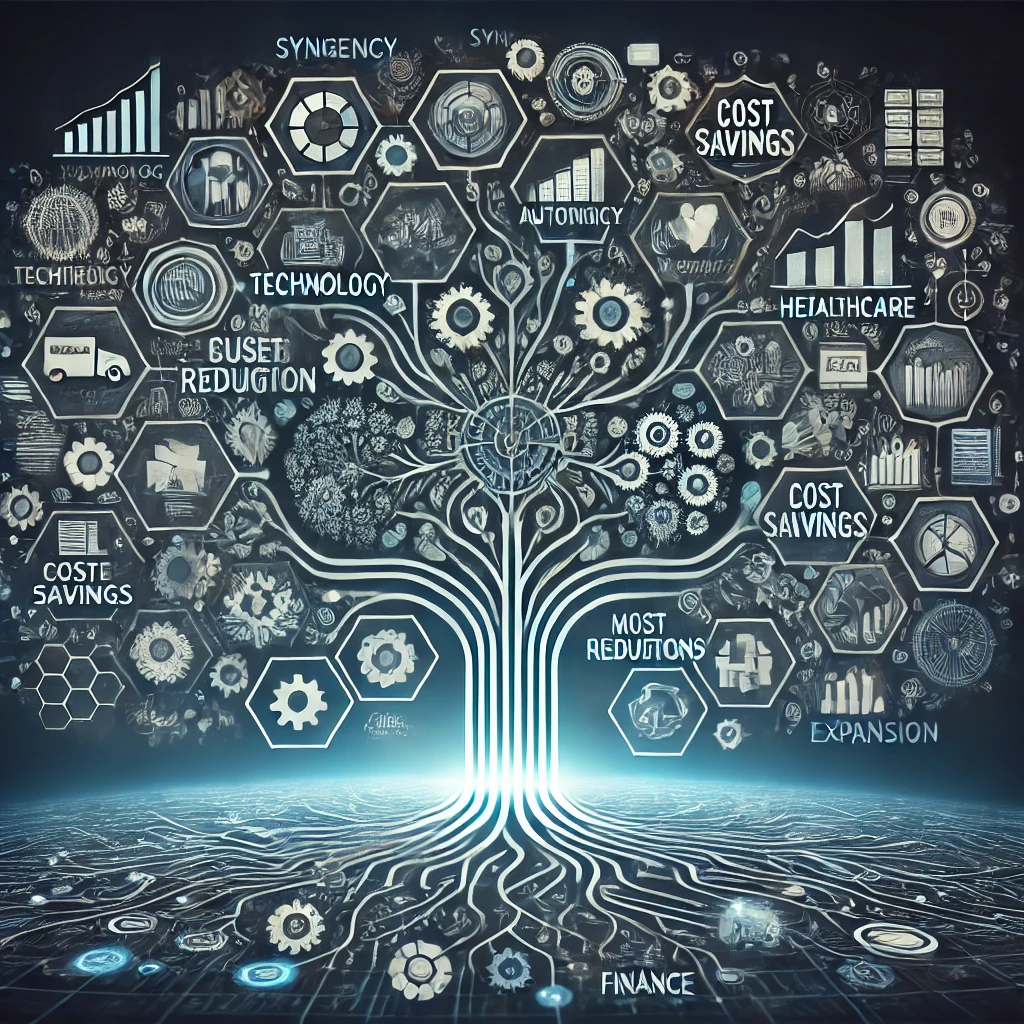 Here is an illustration of business diversification, showing a company branching into multiple related industries, emphasizing synergy, cost reduction, and market expansion.