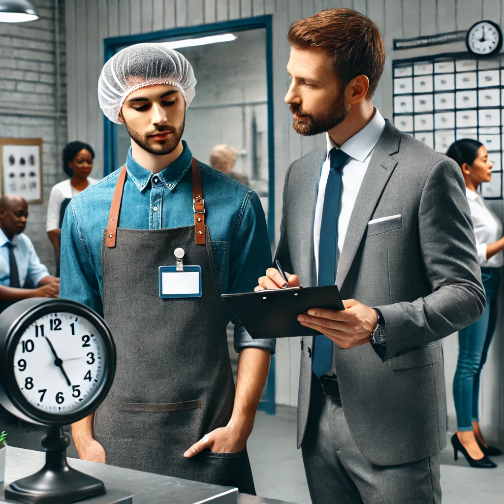 I have generated an image of a professional workplace setting where employees are clocking in on time, with a manager observing and providing feedback. Let me know if you need any modifications or additional details!