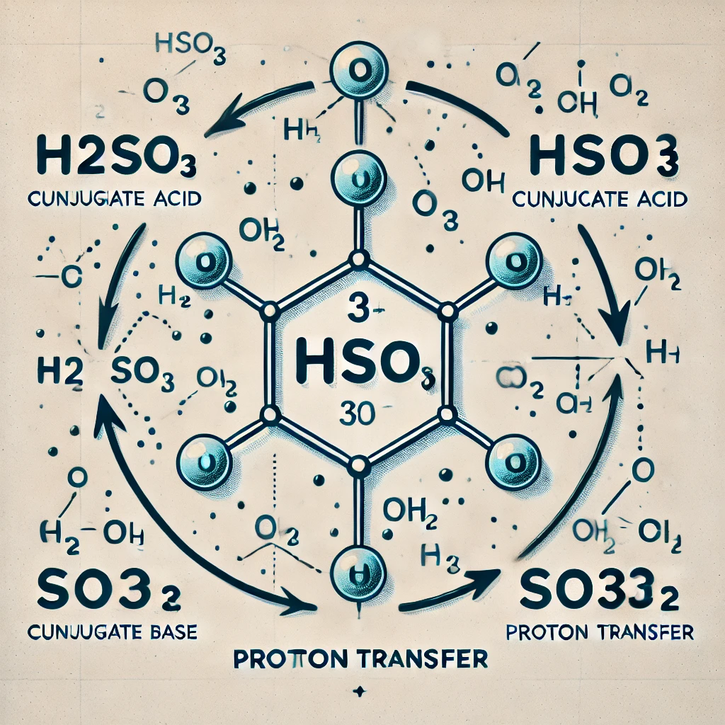I’ve provided an image illustrating the conjugate acid-base relationship of HSO₃⁻. It visually represents how HSO₃⁻ transitions to its conjugate acid (H₂SO₃) and conjugate base (SO₃²⁻) through proton transfer.