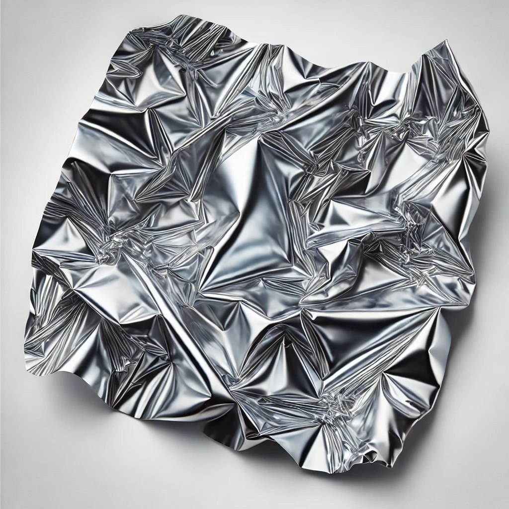 Here is a realistic image of crumpled aluminum foil, showcasing its shiny metallic surface with detailed texture and reflections.