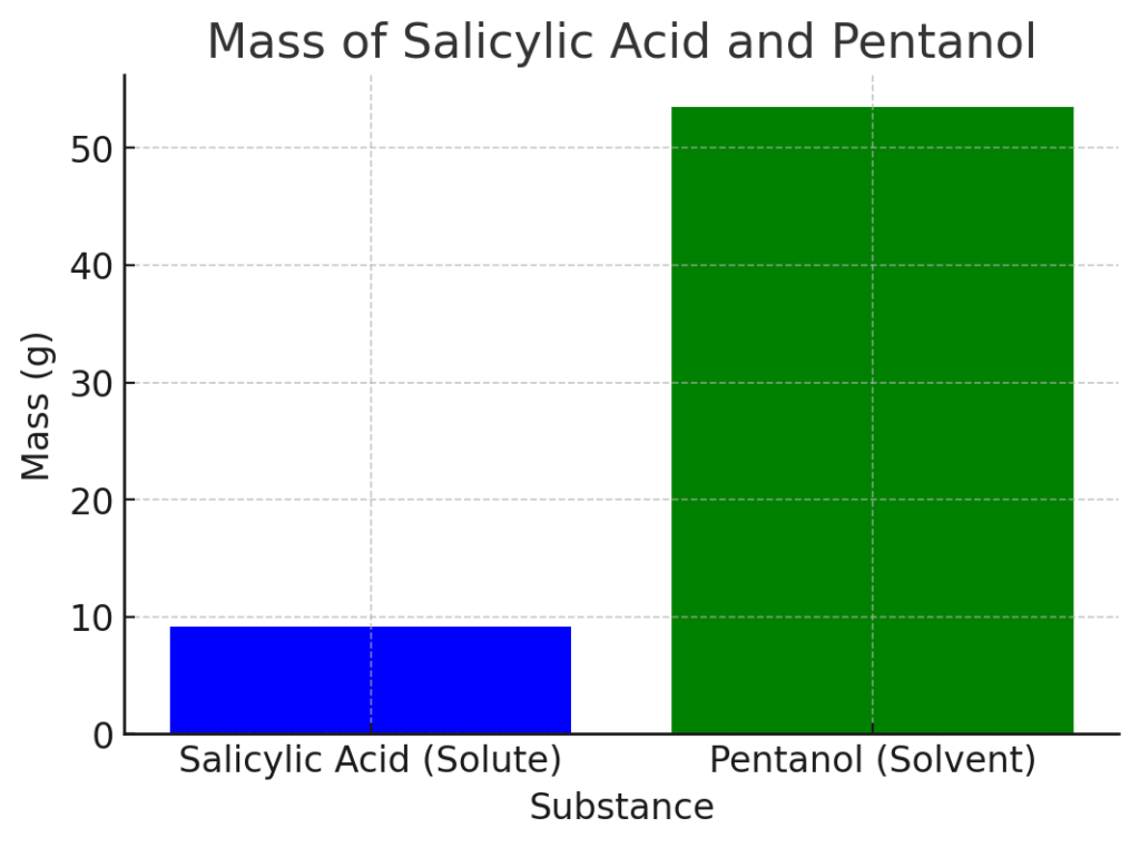 Here is a bar plot showing the mass of salicylic acid (solute) and pentanol (solvent) used in the solution. As you can see, the mass of pentanol is significantly higher than that of salicylic acid, which is typical for solutions with a small amount of solute relative to the solvent. This visual aids in understanding the concentration calculation.