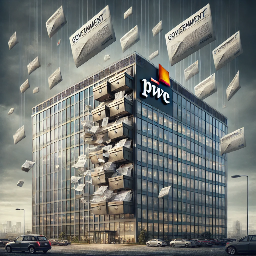 Here is a conceptual image illustrating the PwC Australia tax scandal, with a stormy sky symbolizing the controversy, and confidential government documents spilling out of the building. This visual representation emphasizes the breach of trust and the resulting investigations.