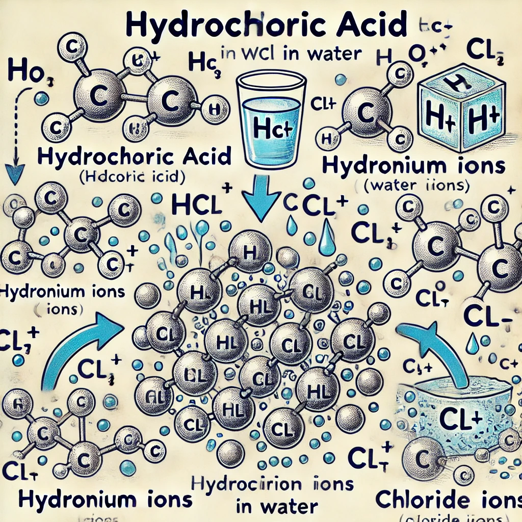 Here is a diagram illustrating the ionization of hydrochloric acid (HCl) in water. It shows how HCl dissociates into hydrogen ions (H⁺) and chloride ions (Cl⁻), with the hydrogen ions quickly associating with water molecules to form hydronium ions (H₃O⁺). This visual should help clarify the process of acid dissociation and the formation of the most abundant ions in an acidic solution.
