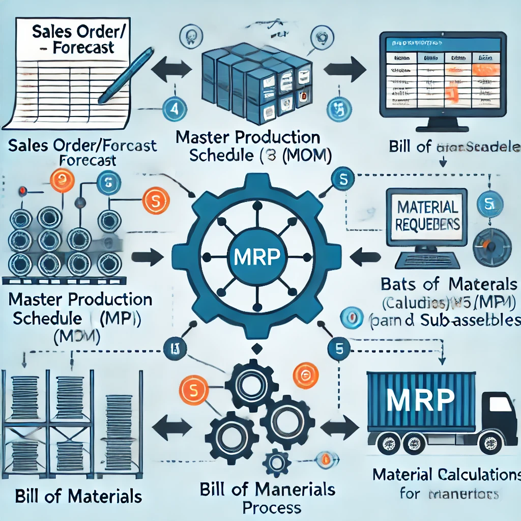 The image above illustrates the concept of Material Requirements Planning (MRP) in a manufacturing environment. It shows the flow of information from sales orders and forecasts to the final MRP calculations, determining the material requirements for parts, components, and subassemblies. This process is essential for ensuring that all necessary materials are available for production in the right quantity and at the right time.