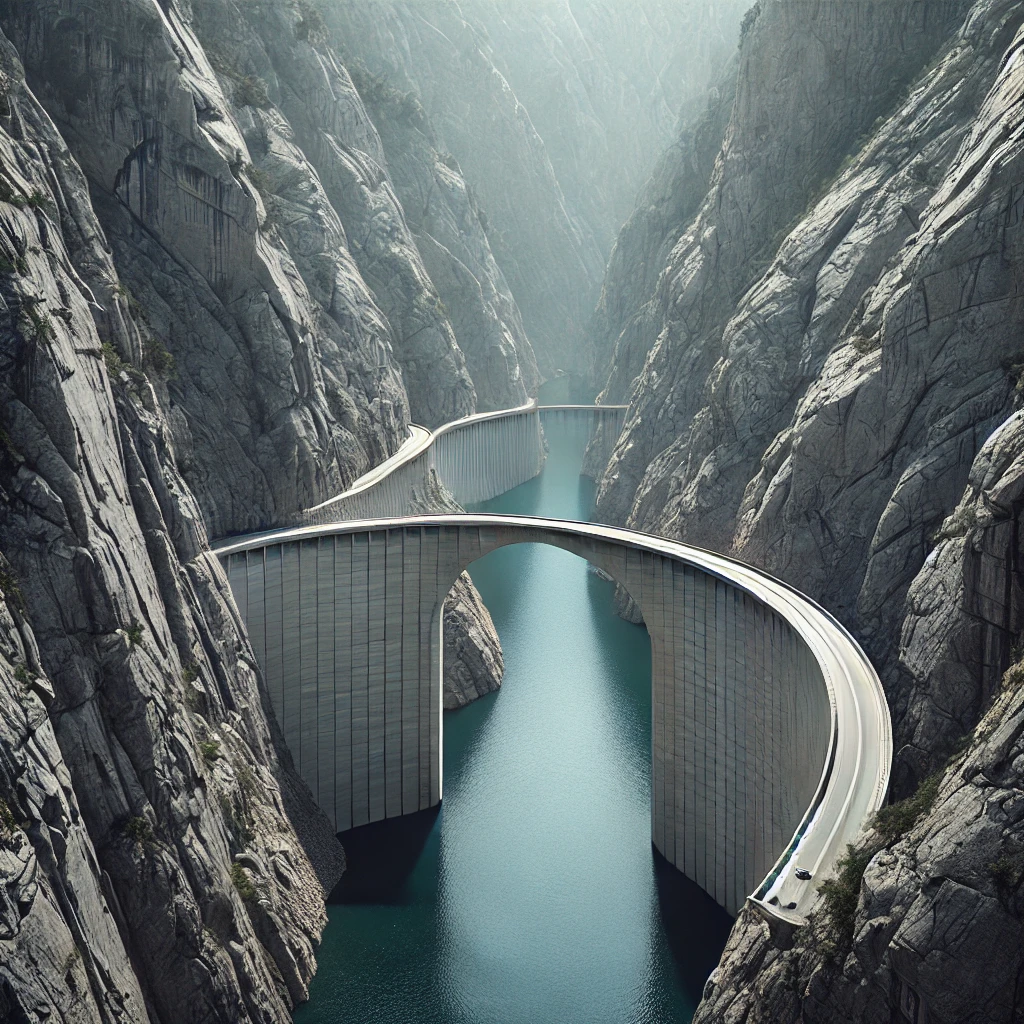 An Arch Dam is a type of dam that is constructed as a concrete or masonry wall across a narrow valley or gorge. This type of dam is designed to use its shape to transfer the water pressure to the canyon walls. The primary characteristic of an arch dam is its curved design, which allows it to be thinner than other types of dams, such as gravity dams, and it relies heavily on the natural strength of the canyon walls to support the structure.