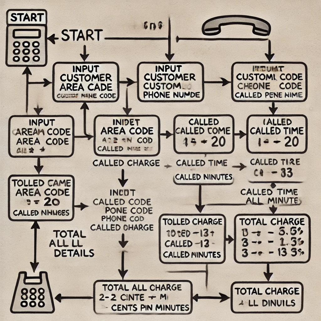 - Conditional Logic: The program checks if the called area code differs from the customer’s area code, and if the call lasts more than 20 minutes. If both conditions are true, the charge is calculated at 2 cents per minute; otherwise, it’s 13 cents per minute.