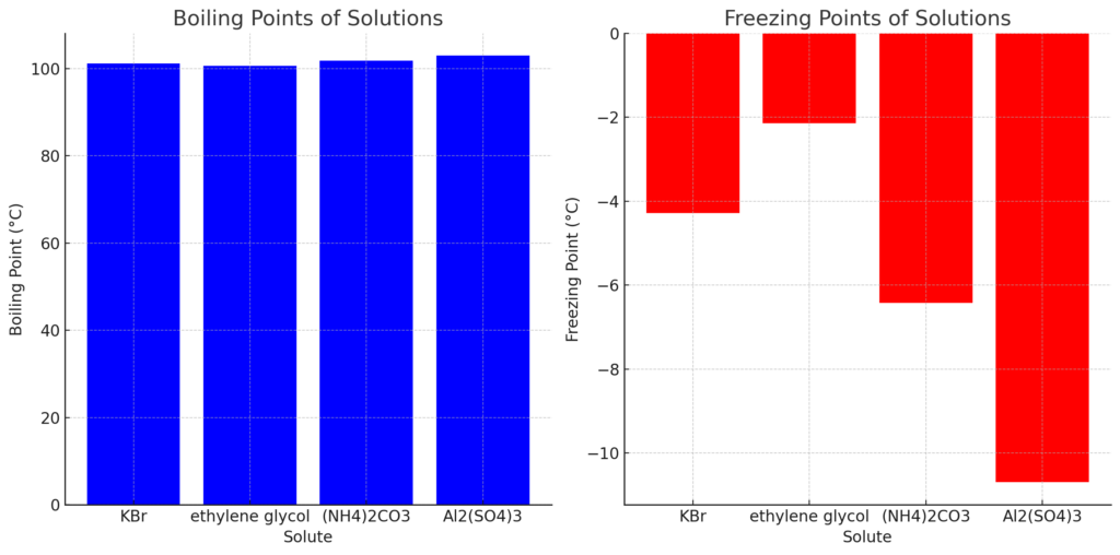 • Boiling Points: The more the solute dissociates, the higher the boiling point, with Al2(SO4)3 raising the boiling point the most.