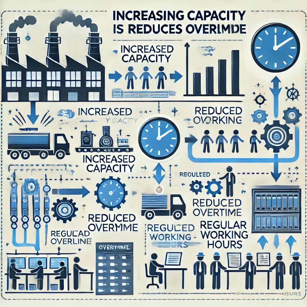 Here is the infographic illustrating how increasing capacity can reduce overtime in a business. It shows how enhancing production capacity can help reduce the need for overtime, leading to more efficient use of regular working hours.