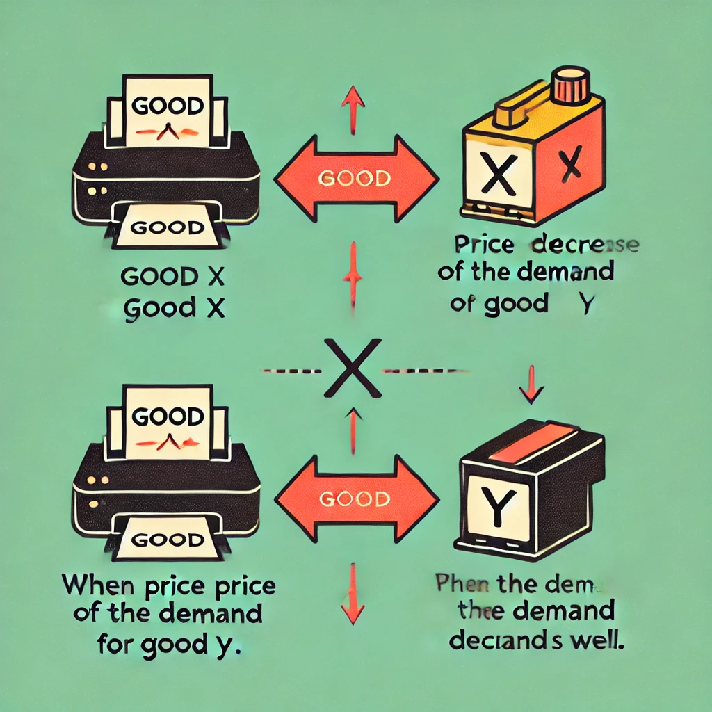 The image above illustrates the concept of complementary goods, showing the relationship between Good X and Good Y. As the price of Good X decreases, the demand for Good Y decreases as well. This type of relationship is typical of complementary goods, which are often used together. In the example, a printer and ink cartridge are depicted as complementary goods, where the demand for ink cartridges might drop if the price of the printer decreases.