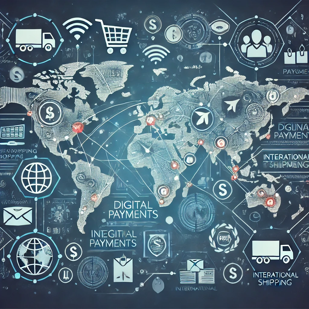 Here is an illustration representing the concept of global e-commerce, showing the interconnectedness of international trade, online shopping, digital payments, and international shipping across various regions of the world.