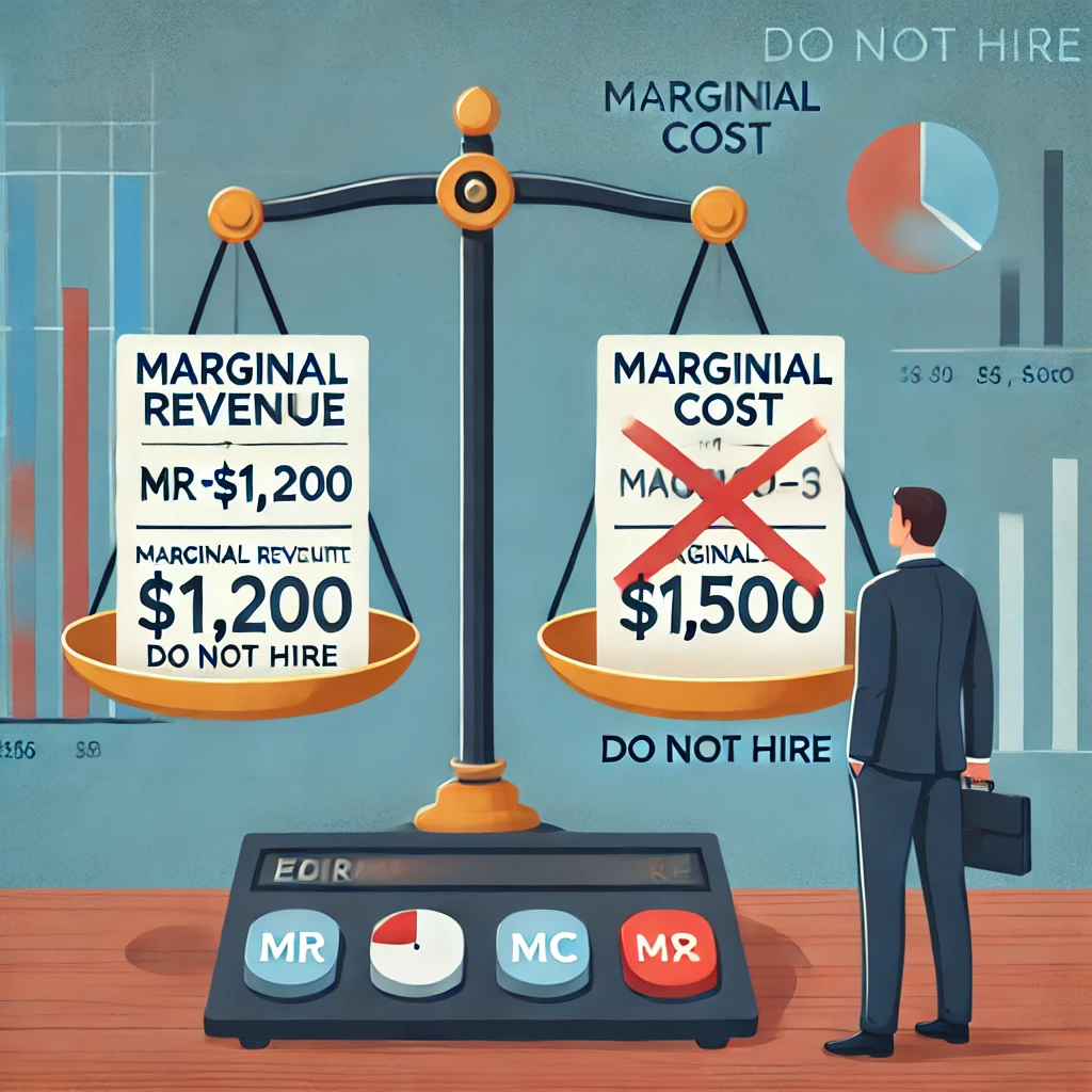 Since the firm would lose $300 per week by hiring this worker ($1,500 cost vs. $1,200 revenue), the rational decision is not to hire. In competitive business environments, firms aim to maximize profit, so hiring when MR < MC leads to losses.