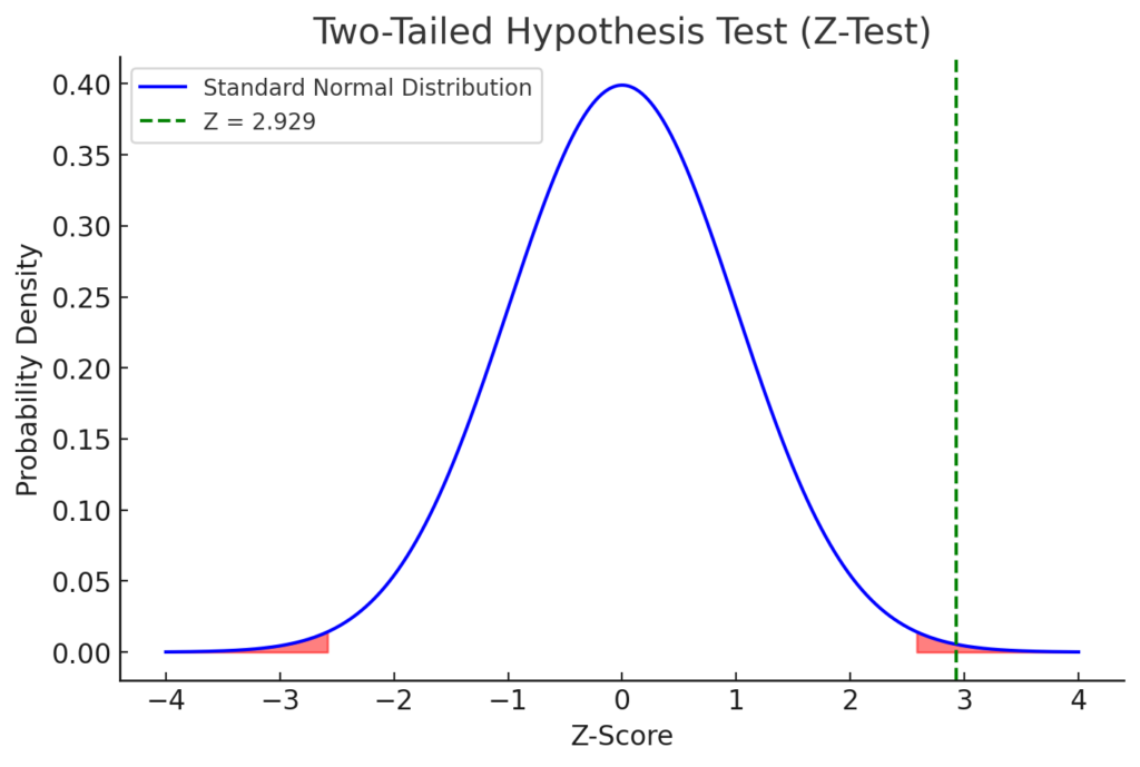 The image above illustrates the two-tailed Z-test for this hypothesis test. The red-shaded areas represent the rejection regions at a 0.01 significance level, while the green dashed line marks the computed test statistic (Z = 2.929). Since the test statistic does not exceed the critical value for rejection (approximately ±2.576 for a 0.01 significance level), the result suggests that we may need to further analyze whether we reject the null hypothesis.