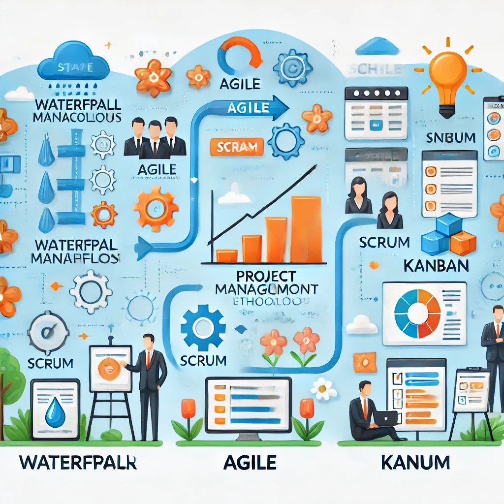 Here is an infographic illustrating different project management methodologies, including Waterfall, Agile, Scrum, and Kanban.