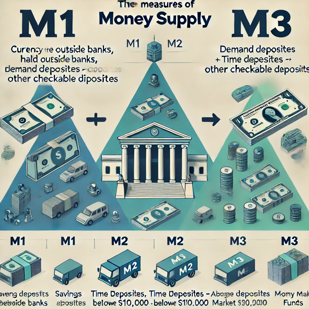 Here is an infographic explaining the different measures of money supply (M1, M2, M3). The diagram visually represents how M1 is the most liquid form of money, with M2 and M3 progressively including less liquid assets.