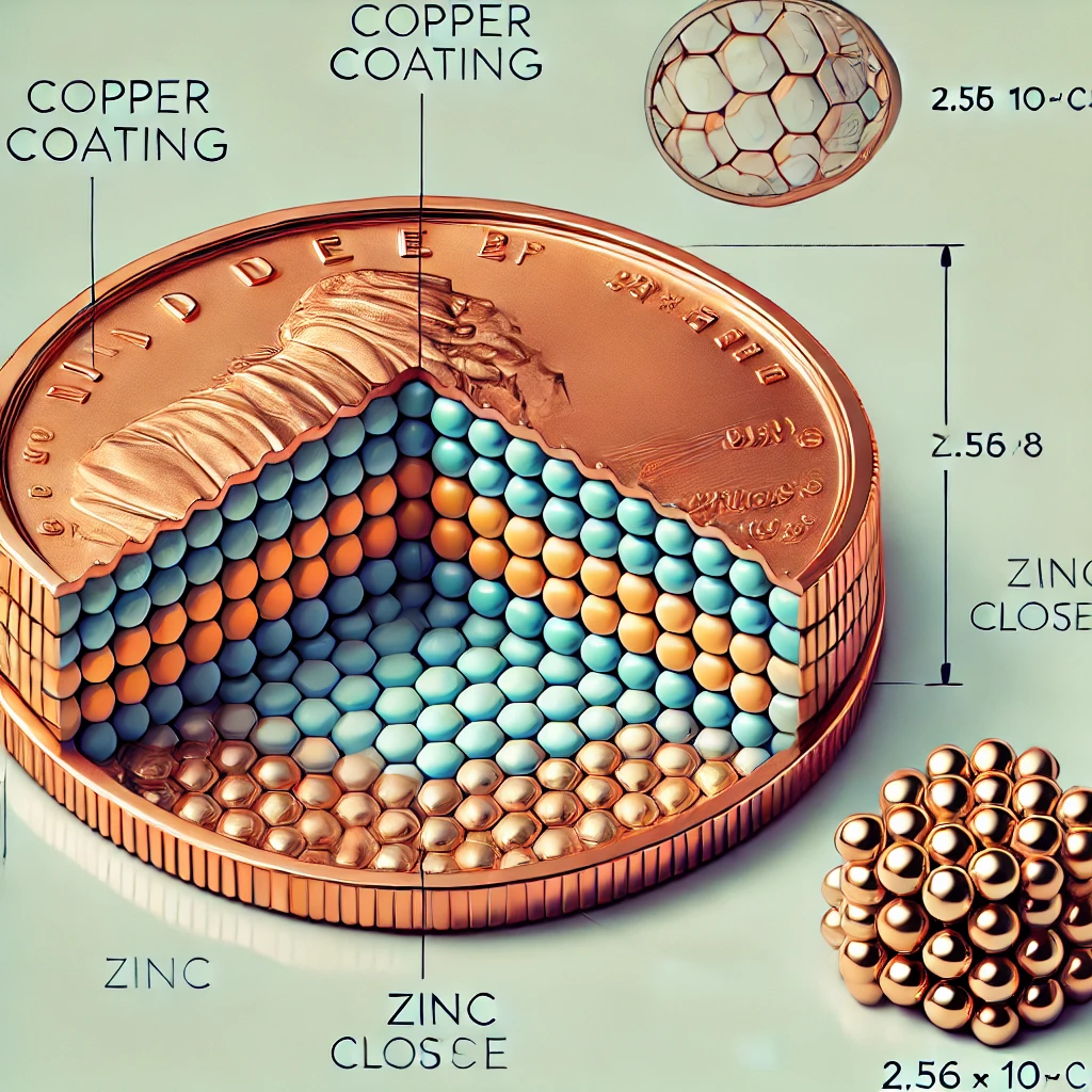 Here is an illustration showing the thickness of the copper coating on a penny at the atomic scale. It includes a zoomed-in cross-section with labeled layers and a magnified view of individual copper atoms.