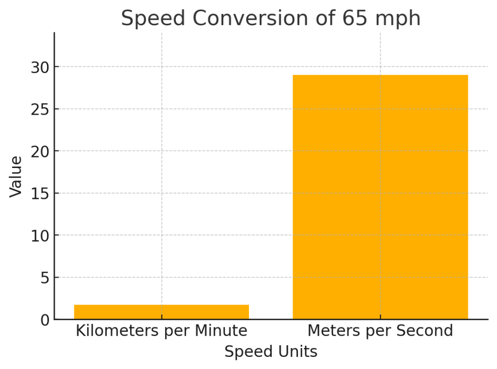 1. We know 1 mile = 1609 meters, so convert 65 miles per hour to meters per hour: