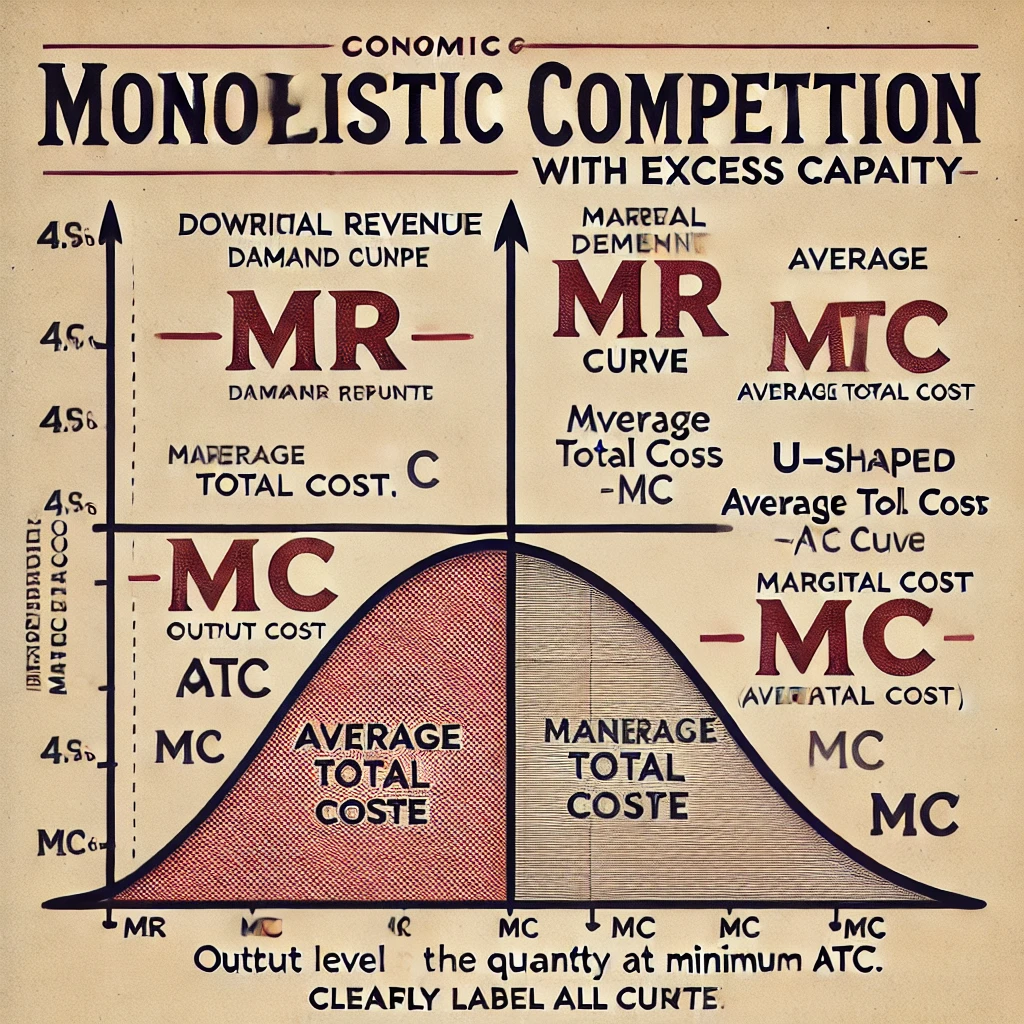 Here is an economic diagram illustrating monopolistic competition with excess capacity. The graph shows the demand curve, marginal revenue (MR) curve, average total cost (ATC) curve, and marginal cost (MC) curve, with the firm’s equilibrium where MR = MC, but the output level is below the minimum ATC, indicating excess capacity.