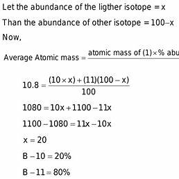 Let ( x ) represent the fractional abundance of ^10B. Consequently, the fractional abundance of ^11B would be ( 1 – x ). The equation for the average atomic mass becomes: