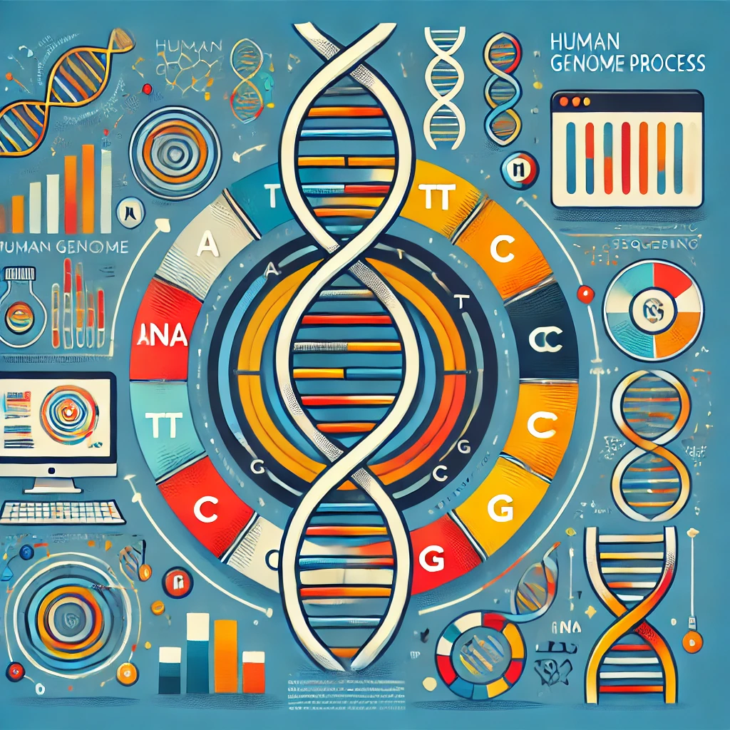 Here is an infographic illustrating the human genome mapping process. It visually represents a DNA double helix with nucleotide bases, a chromosome with genetic markers, and a digital sequencing process.