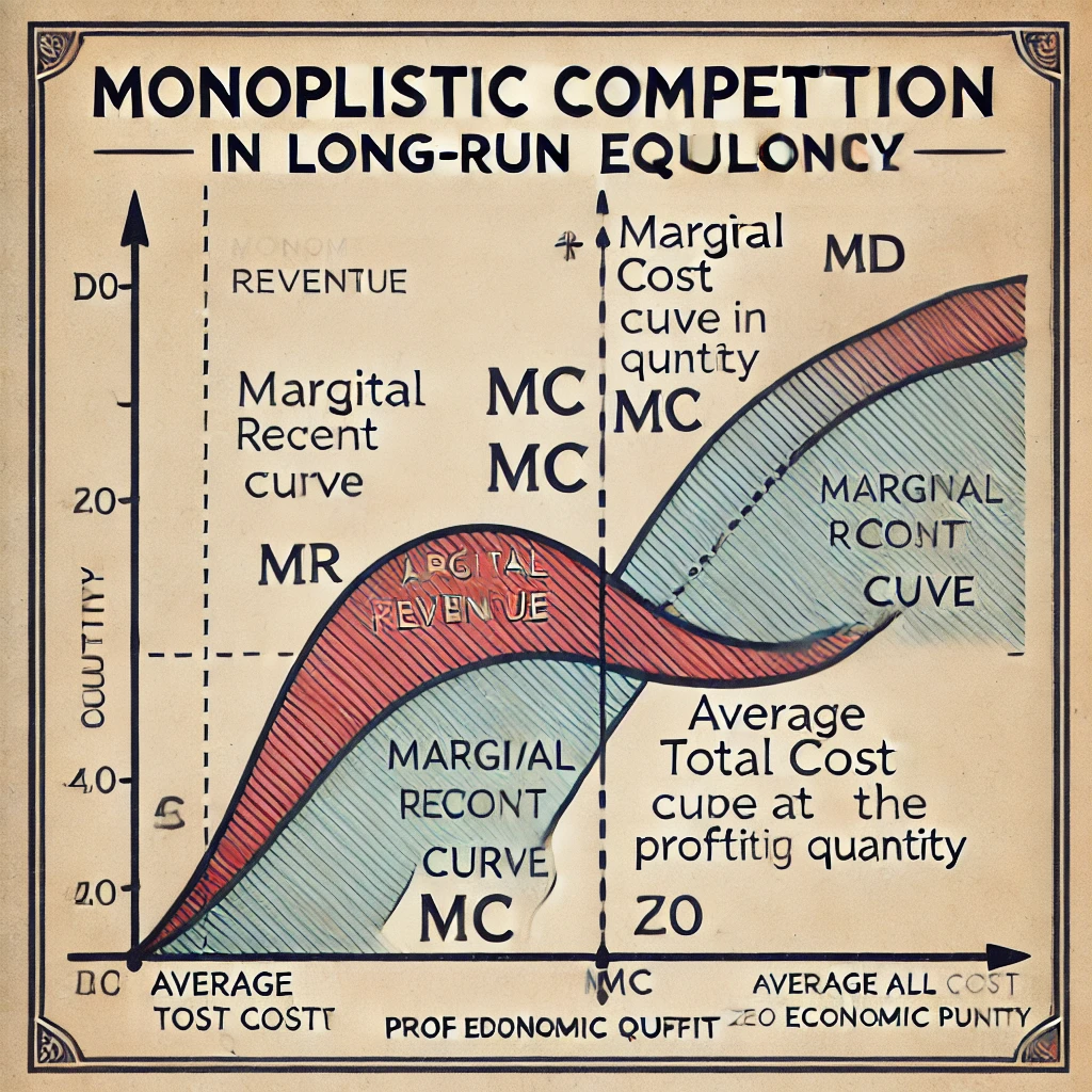 Monopolistic competition is a market structure characterized by many firms selling differentiated products with relatively free entry and exit. In the long-run equilibrium, firms in this market reach a point where they earn zero economic profit, but they still operate with some inefficiencies due to product differentiation and brand loyalty.