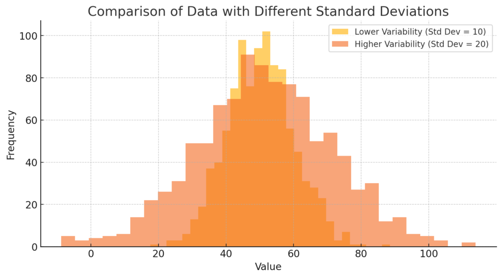 The image above visually represents two datasets with the same mean but different standard deviations. The dataset with a higher standard deviation (20) is more spread out, while the one with a lower standard deviation (10) is more concentrated around the mean.