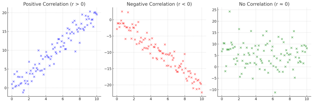 - Positive Correlation (Left Plot, Blue): As one variable increases, the other also increases, indicating a direct relationship.