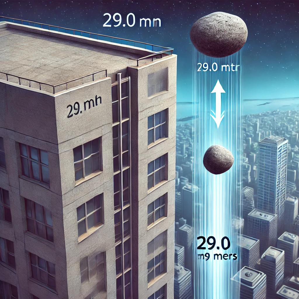 Here is an illustration showing the two stones being dropped from a tall building, with the first stone farther down and the second one higher up but accelerating downward. The vertical separation of 29.0 meters is marked between them.