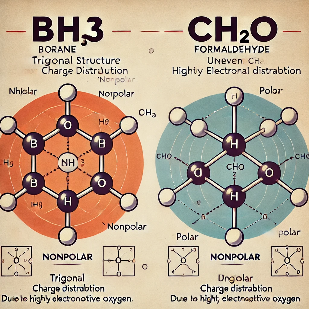 Here is a scientific diagram comparing the molecular structures of BH₃ (borane) and CH₂O (formaldehyde). It illustrates their trigonal planar shapes, the symmetrical charge distribution in BH₃ (nonpolar), and the dipole movement in CH₂O (polar) due to the highly electronegative oxygen.