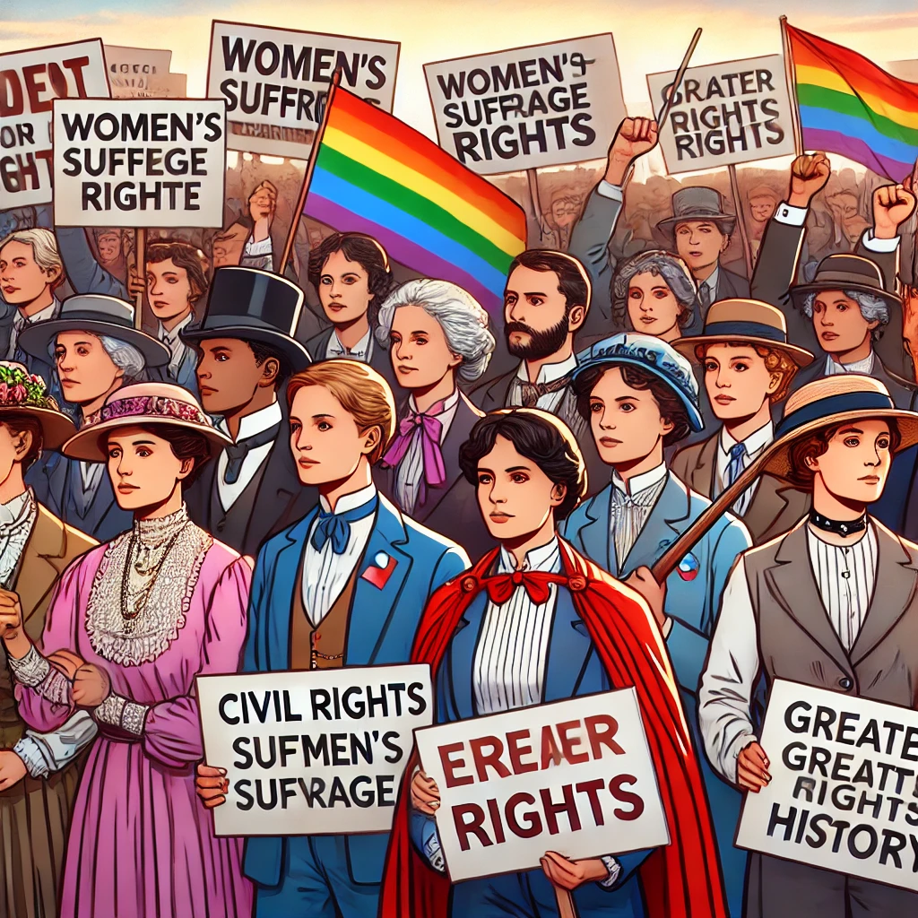 Now, I’ll generate an image depicting a diverse group of activists holding signs and banners, symbolizing the struggle for civil rights across different movements.