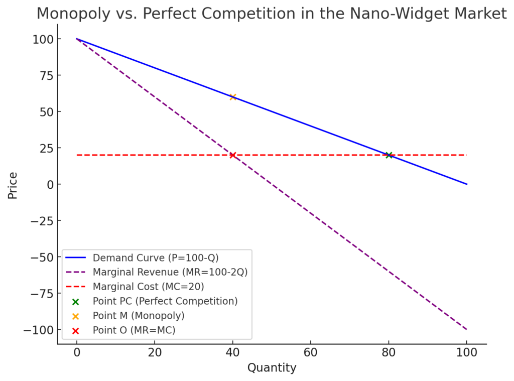 The graph above illustrates the transition from a perfectly competitive market to a monopoly in the nano-widget market.