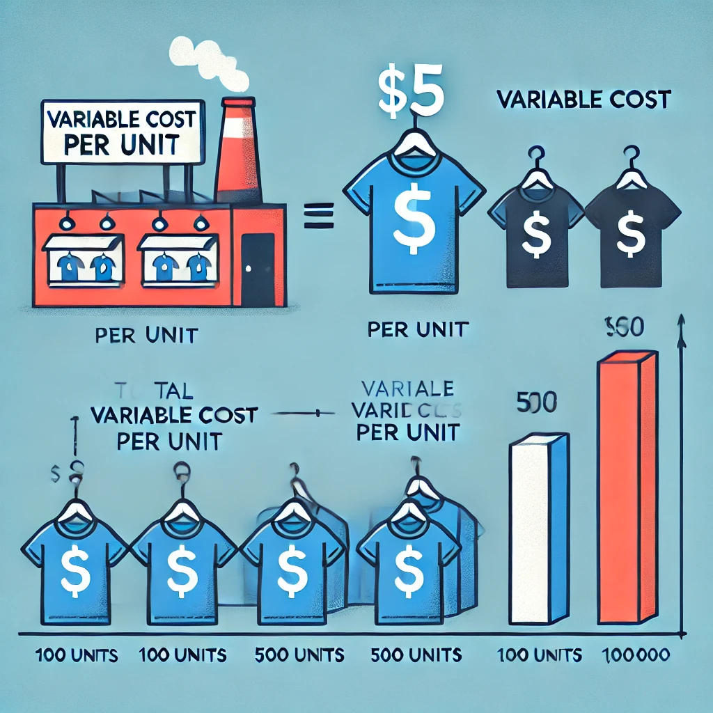 For example, consider a company that manufactures T-shirts. If the cost of fabric, labor, and other direct materials is $5 per T-shirt, then this cost remains the same whether the company produces 100 or 10,000 T-shirts. The total variable cost will increase as more units are produced, but the cost per unit remains constant.