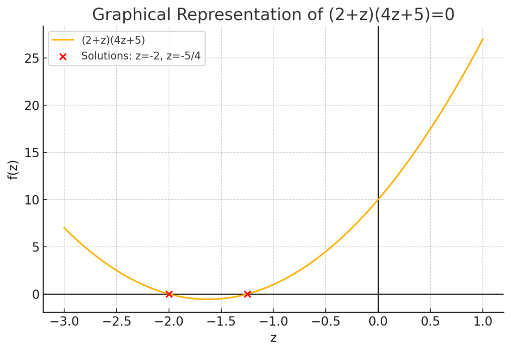 Here’s a graphical representation of the equation (2+z)(4z+5)=0(2+z)(4z+5)=0. The red points indicate the solutions z=−2z = -2 and z=−54z = -\frac{5}{4}, where the function intersects the x-axis. Let me know if you need any further explanation!